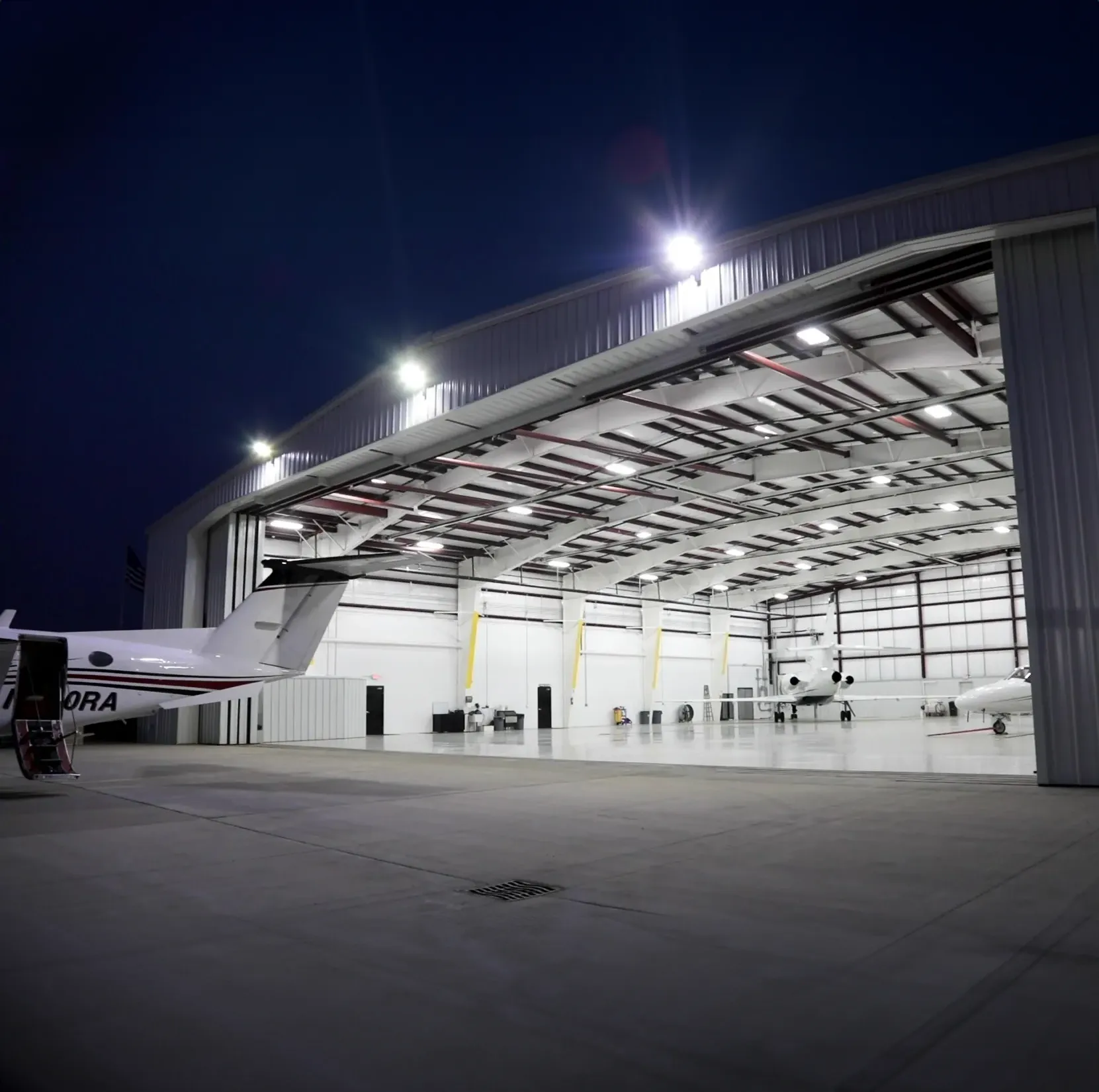 Wide-span steel buildings designed to store and protect aircraft with large door openings and weather-resistant durability.